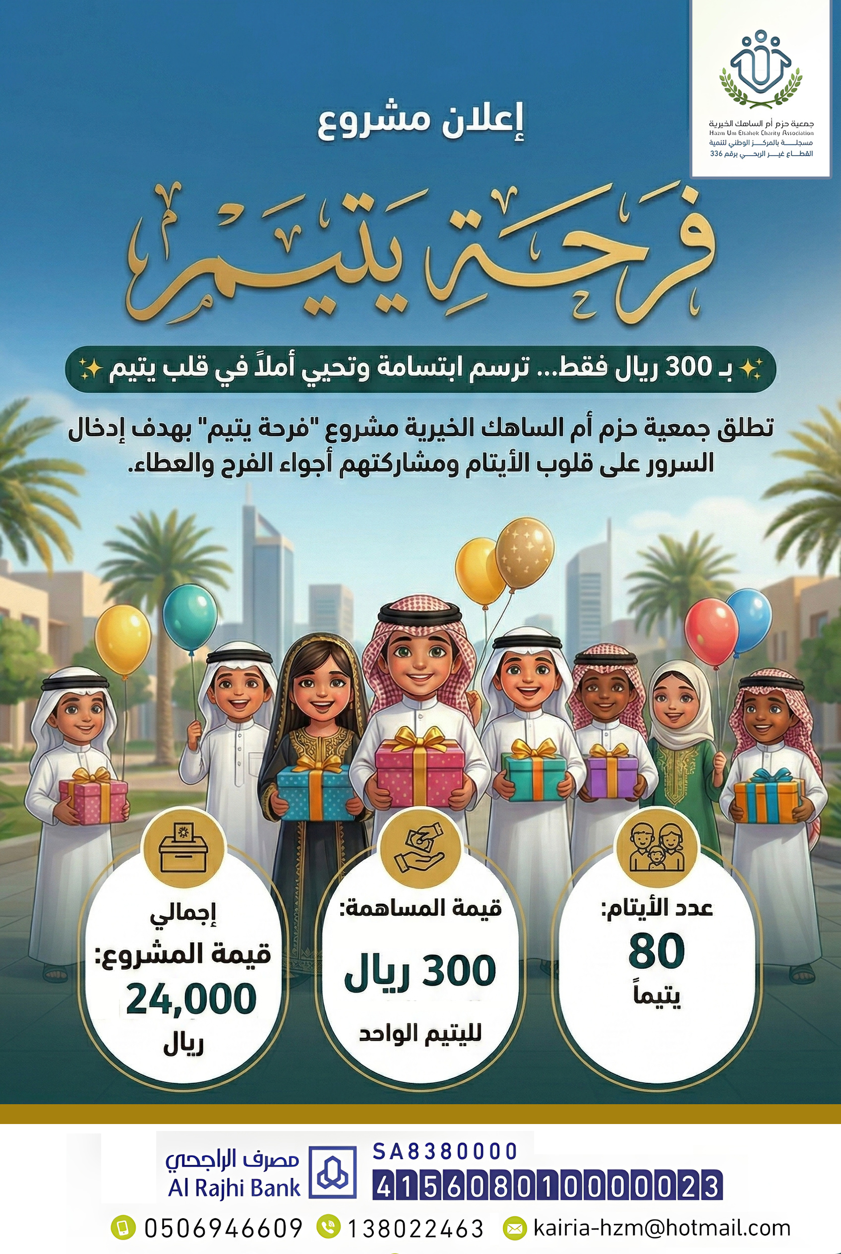 أخبار الجمعية مشروع فرحة يتيم _ 80 يتيم ينتظرونكم نشر في 12 مارس 2026 33اكمل القراءة 33 مشاركة FacebookTwitterWhatsApp
